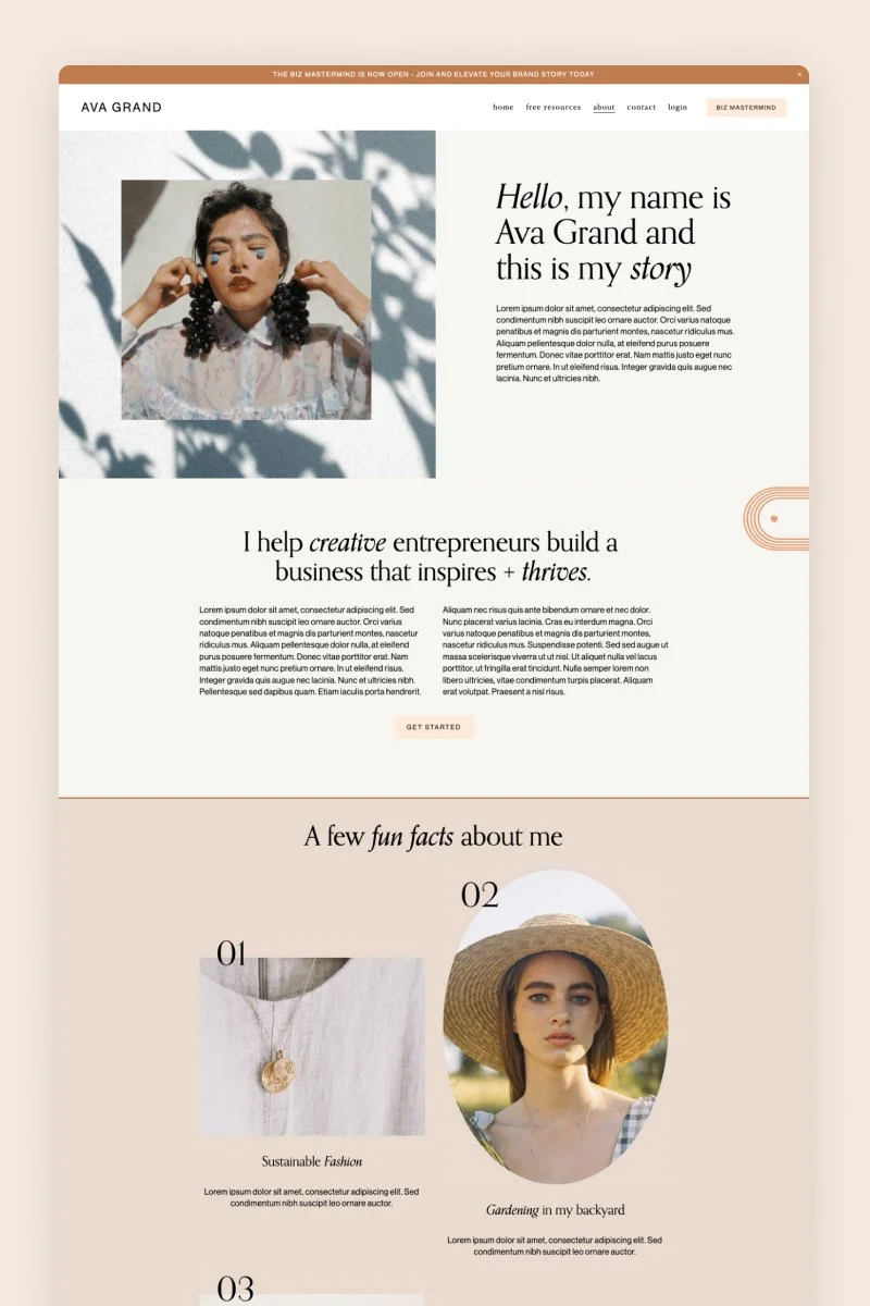 Ava Grand features a modern and sleek layout, combined with earthy colors and subtle animations. Apart from the usual pages, this template has a detailed sales page that can be customized for any product or service. It also has an exclusive member's area, which makes it the ideal match for course creators and lifestyle coaches looking to elevate their brand and get their ideas across with a gorgeous website.