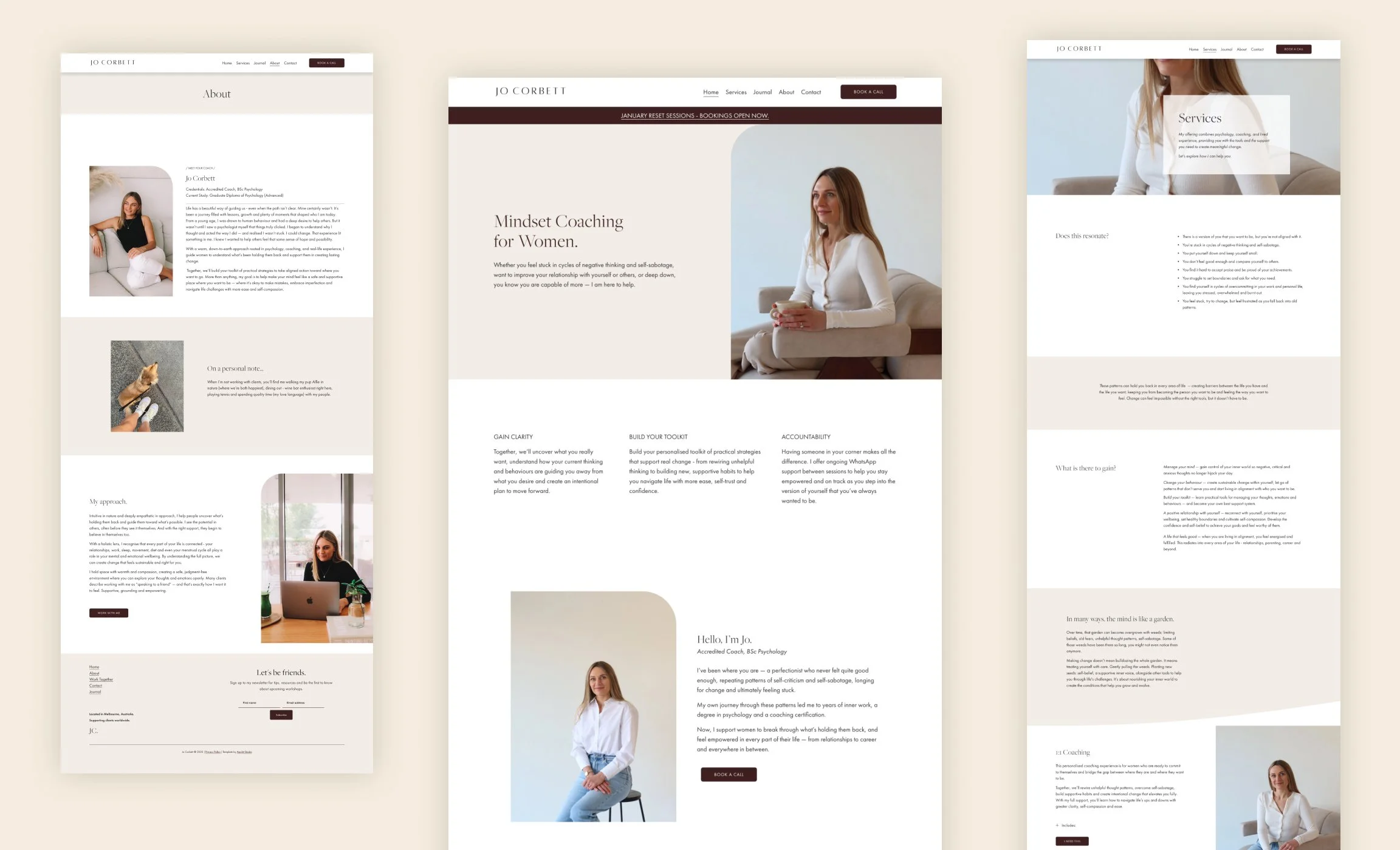 Jo doesn't use stock pictures on her website. All images show the coach in natural environments, reinforcing authenticity. Soft neutrals in Jo’s wardrobe/office reflect and reinforce the website’s palette, creating a thoughtful brand cohesion.